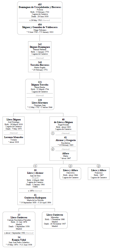 Fueron abuelos de María Benita Íñiguez Terroba (nacida en 1794), quien casó con Domingo Juan Llera Martínez (nacido en 1792, también descendiente del Solar de Valdeosera). Tuvieron dos hijos: José Domingo y Angel Román.